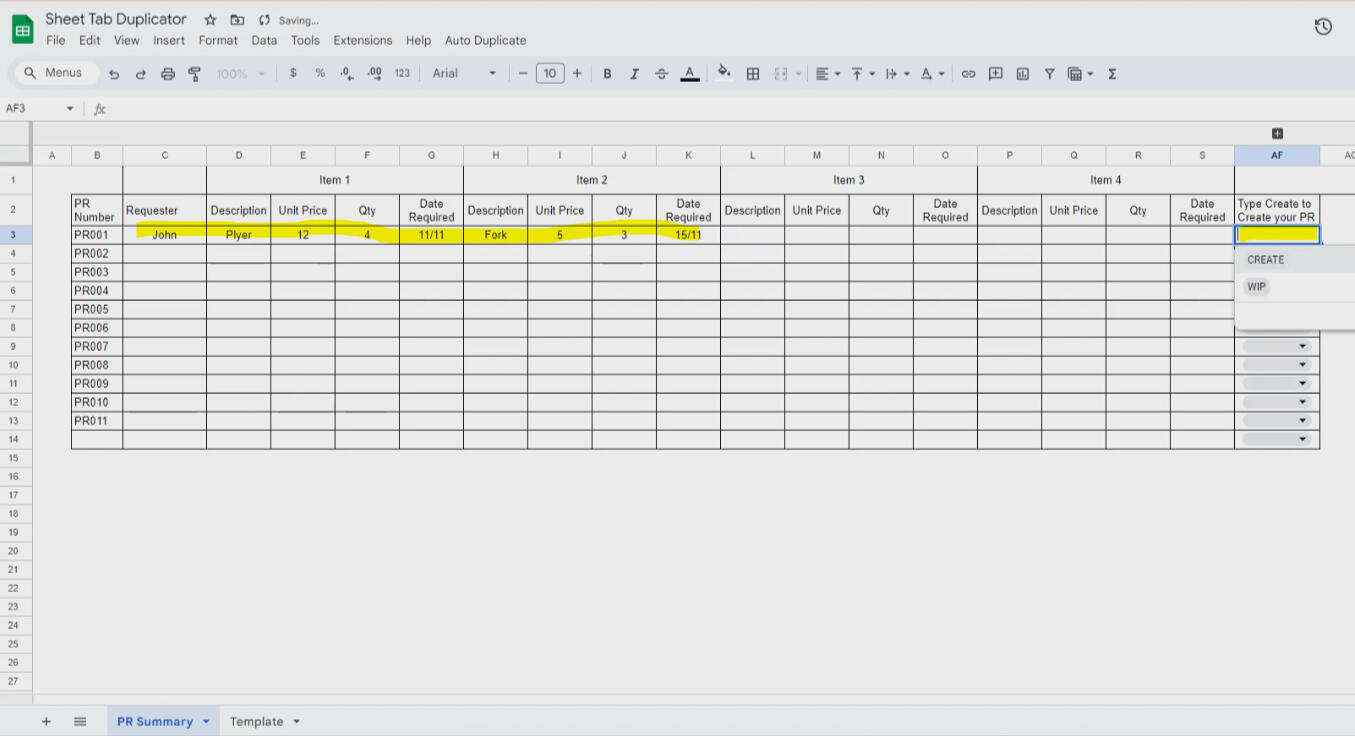 4) Continue update summary and update "CREATE" (all capital letter) on the column you already set above which will trigger to auto duplicate template