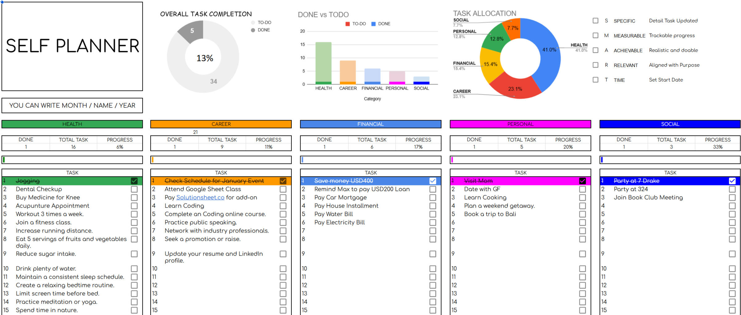 Self Planner - Plan all your task up to five categories with simple check box and auto summarize on top with pie chart , bar graph.